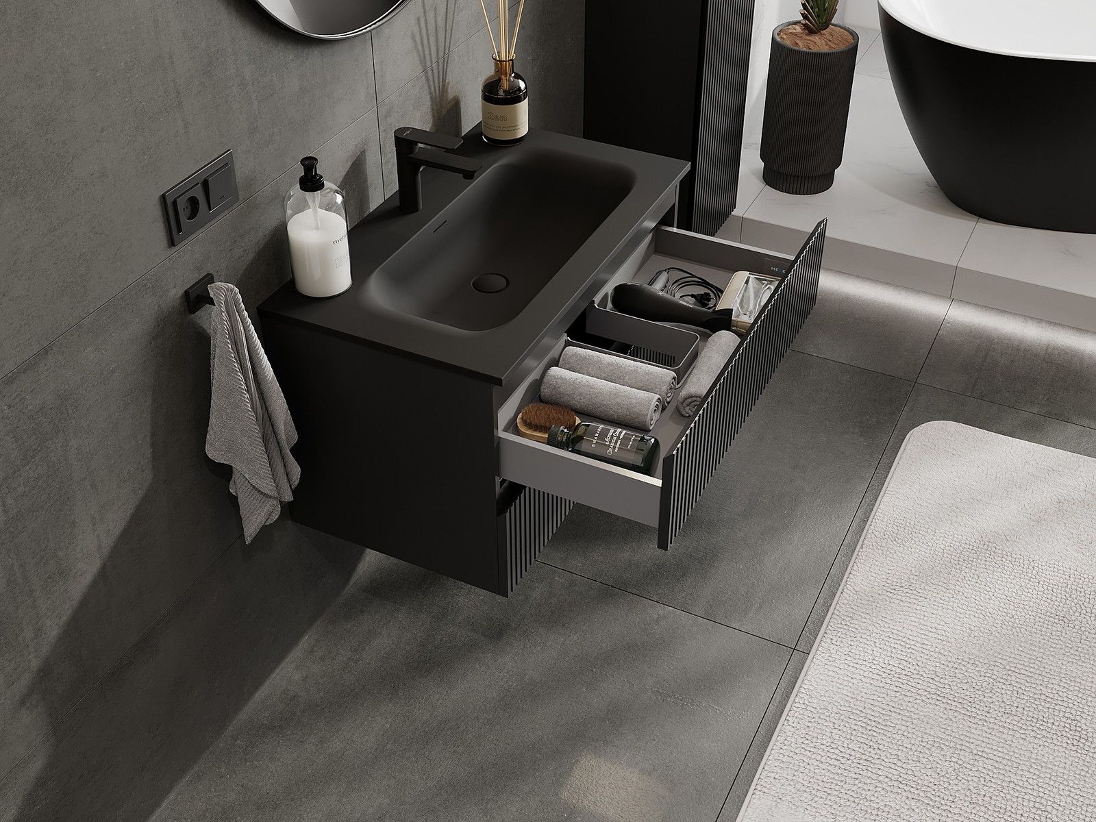 Výřez v zásuvce je navržen tak, aby pojmul sifon, který je nezbytný v instalacích umyvadlových. Díky tomu může být nábytek plně funkčně namontován, aniž by bylo nutné vzdát se prostoru v zásuvce ve prospěch instalace.