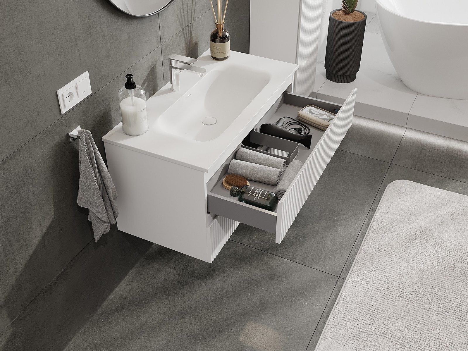 Výřez v zásuvce je navržen tak, aby pojmul sifon, který je nezbytný v instalacích umyvadlových. Díky tomu může být nábytek plně funkčně namontován, aniž by bylo nutné vzdát se prostoru v zásuvce ve prospěch instalace.