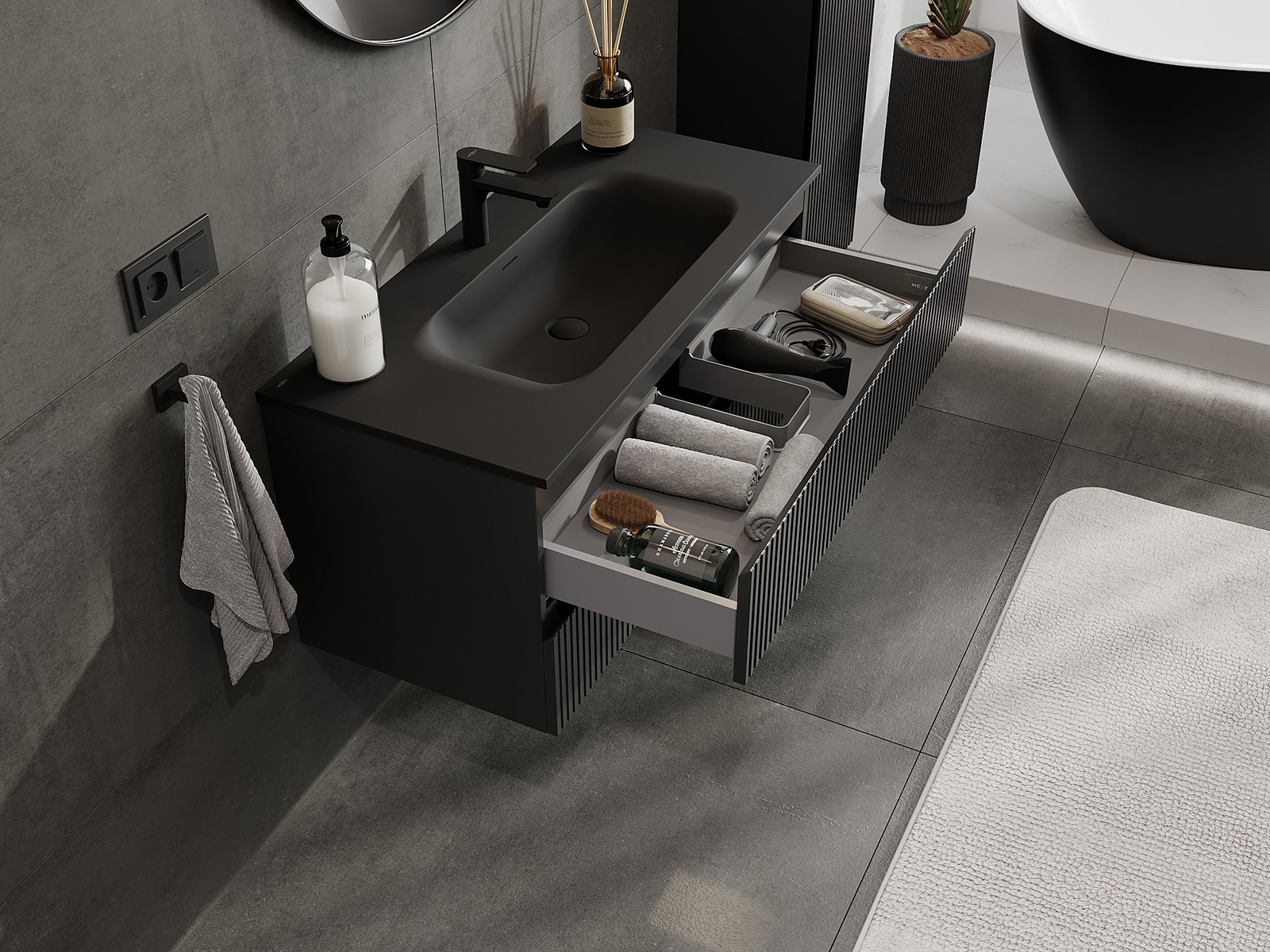 Výřez v zásuvce je navržen tak, aby pojmul sifon, který je nezbytný v instalacích umyvadlových. Díky tomu může být nábytek plně funkčně namontován, aniž by bylo nutné vzdát se prostoru v zásuvce ve prospěch instalace.