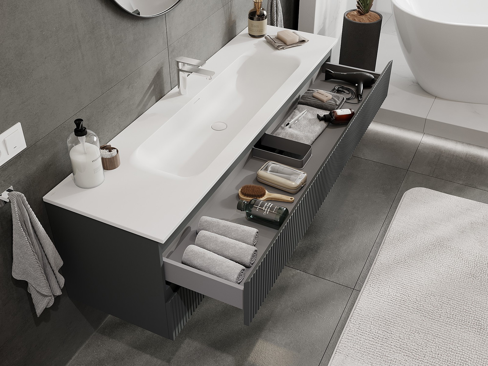 Výřez v zásuvce je navržen tak, aby pojmul sifon, který je nezbytný v instalacích umyvadlových. Díky tomu může být nábytek plně funkčně namontován, aniž by bylo nutné vzdát se prostoru v zásuvce ve prospěch instalace.