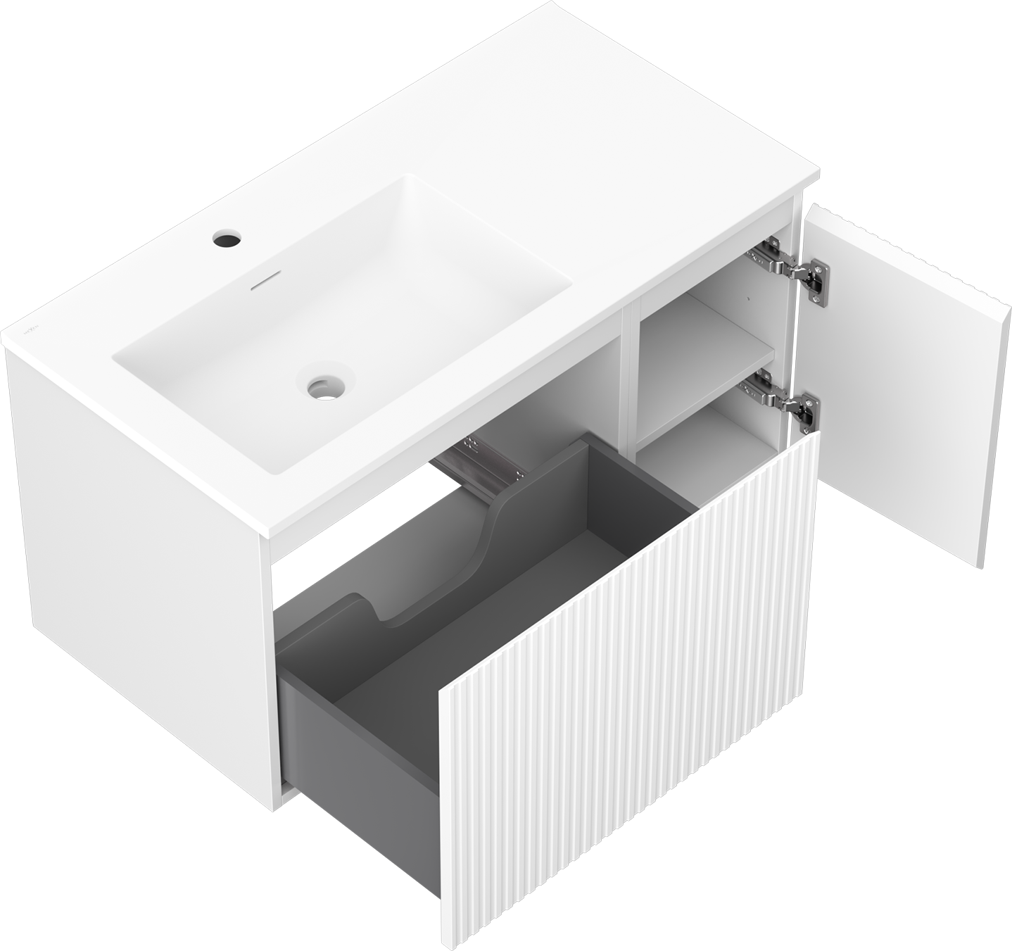 Mexen Rivel koupelnová skříňka 90 cm s levým umyvadlem Otis, 1S, 1D, drážkovaná, bílá matná - 91A23-09047-3-BBFF01-W18L01
