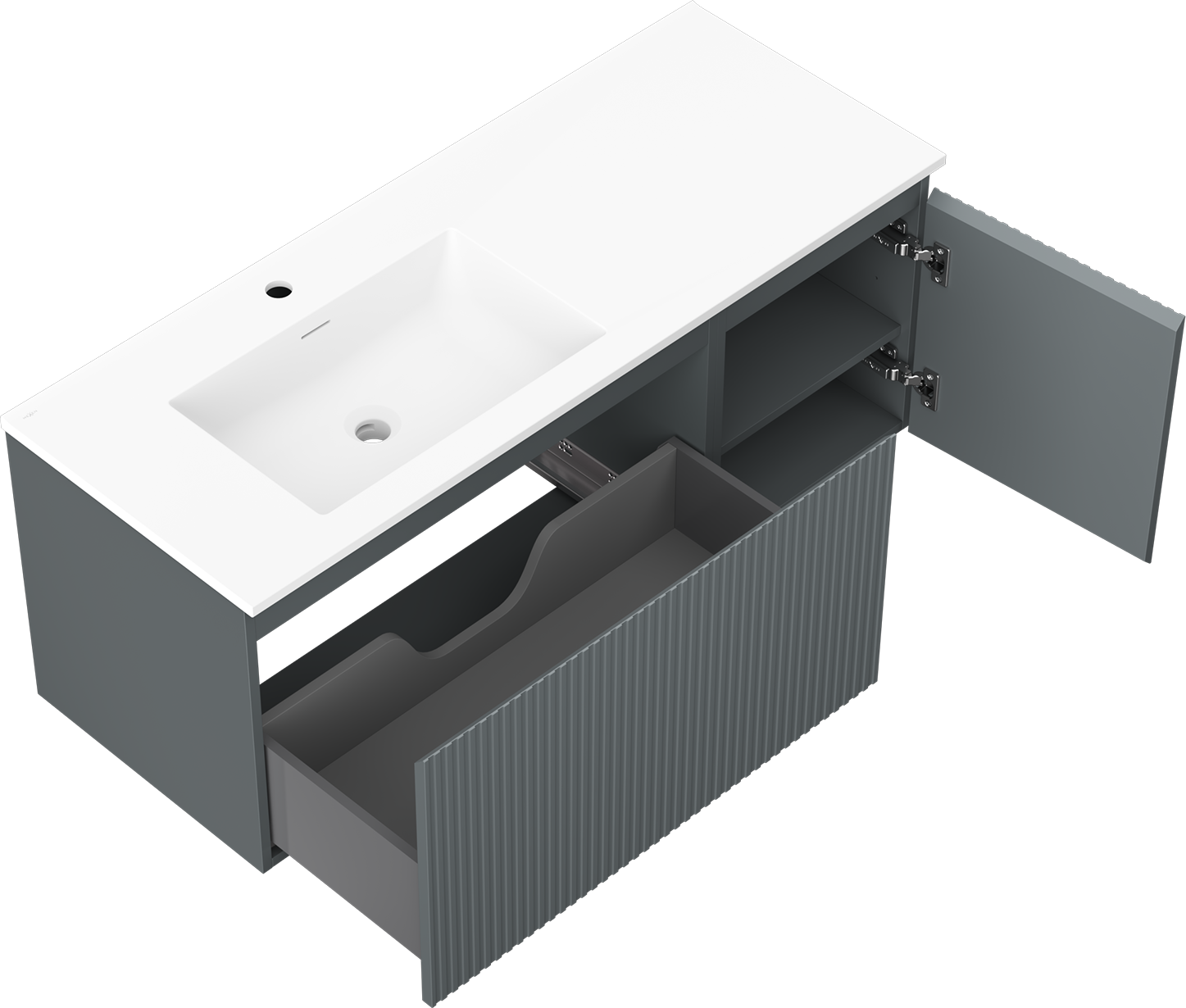 Výřez v zásuvce je navržen tak, aby pojmul sifon, který je nezbytný v instalacích umyvadlových. Díky tomu může být nábytek plně funkčně namontován, aniž by bylo nutné vzdát se prostoru v zásuvce ve prospěch instalace.