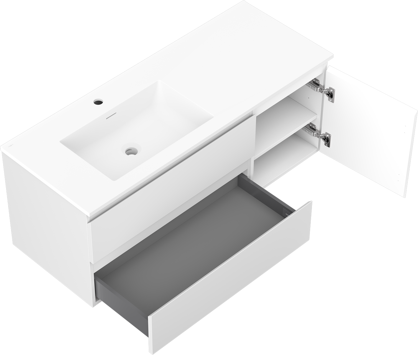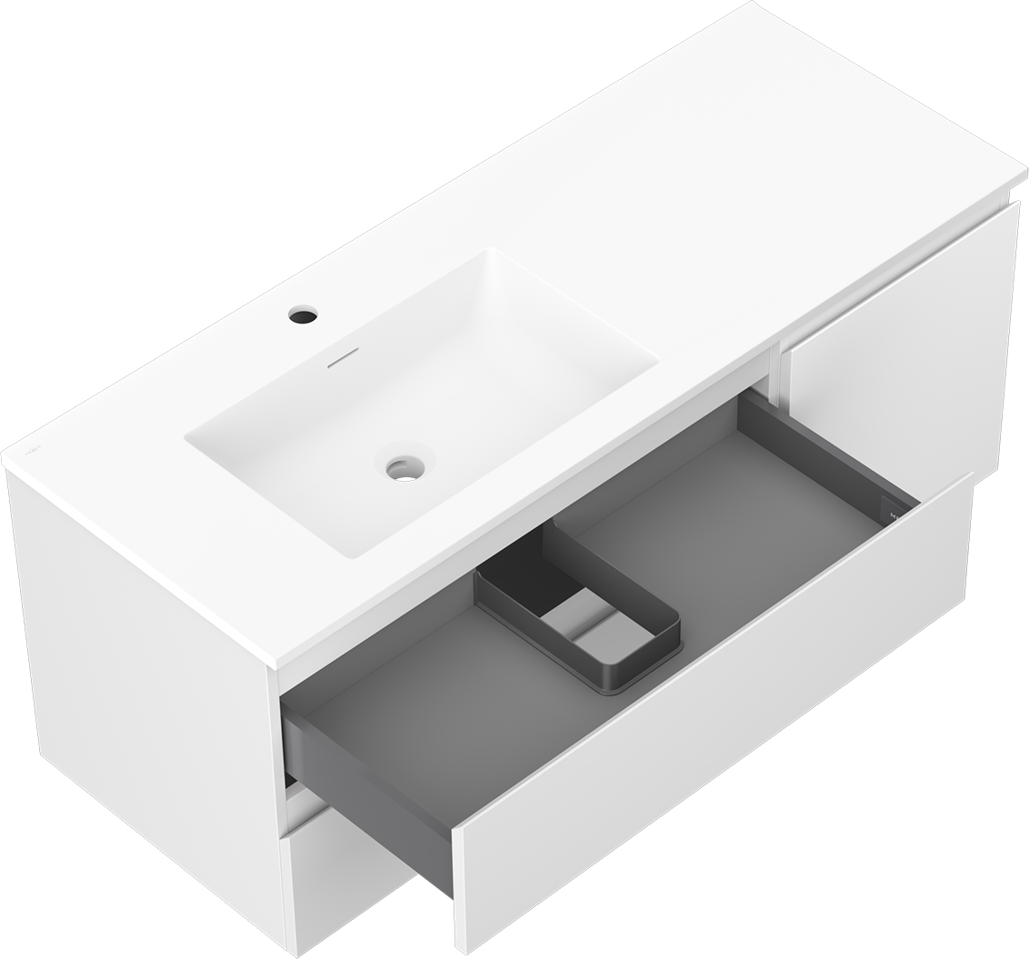 Výřez v zásuvce je navržen tak, aby pojmul sifon, který je nezbytný v instalacích umyvadlových. Díky tomu může být nábytek plně funkčně namontován, aniž by bylo nutné vzdát se prostoru v zásuvce ve prospěch instalace.