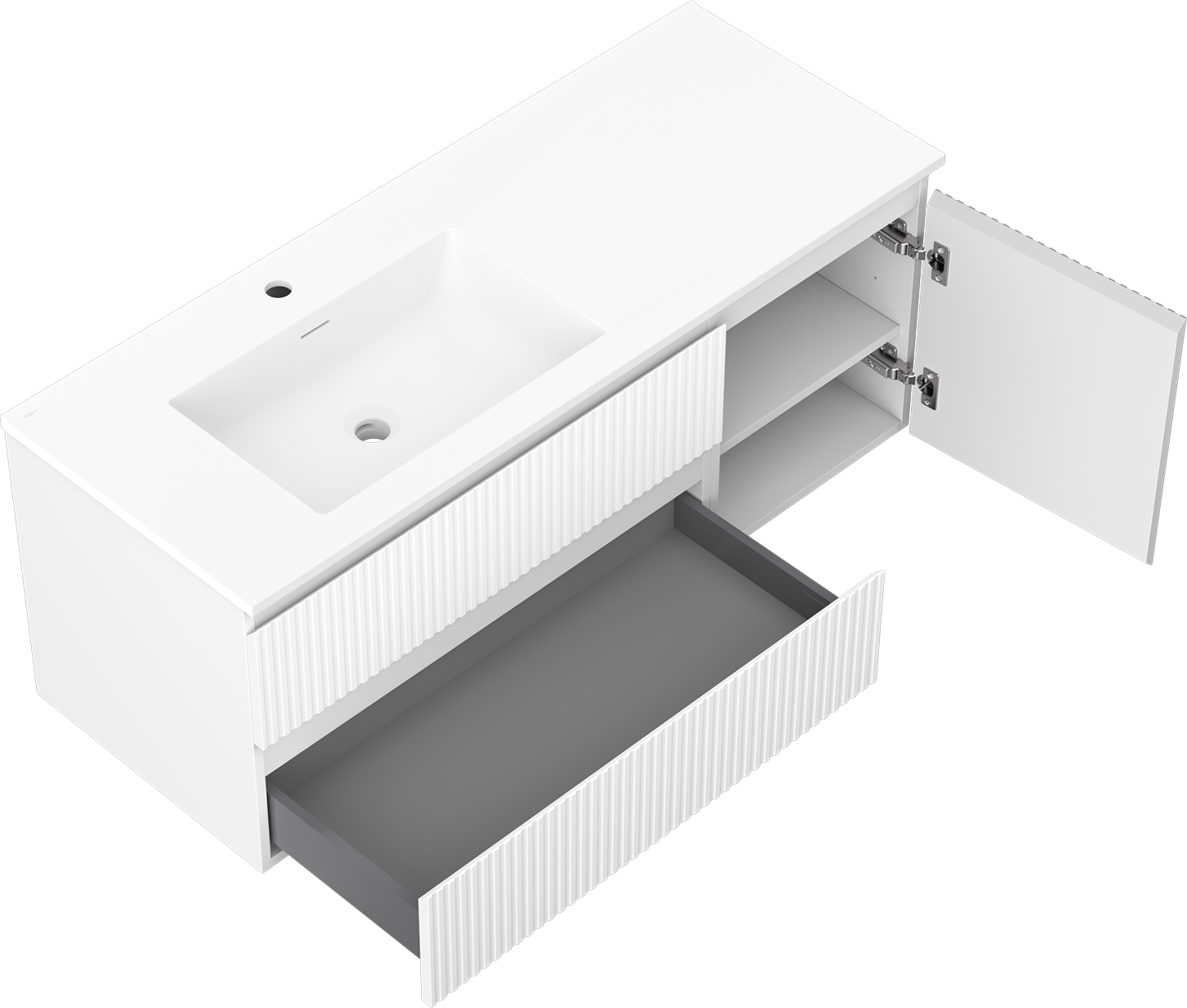 Výřez v zásuvce je navržen tak, aby pojmul sifon, který je nezbytný v instalacích umyvadlových. Díky tomu může být nábytek plně funkčně namontován, aniž by bylo nutné vzdát se prostoru v zásuvce ve prospěch instalace.