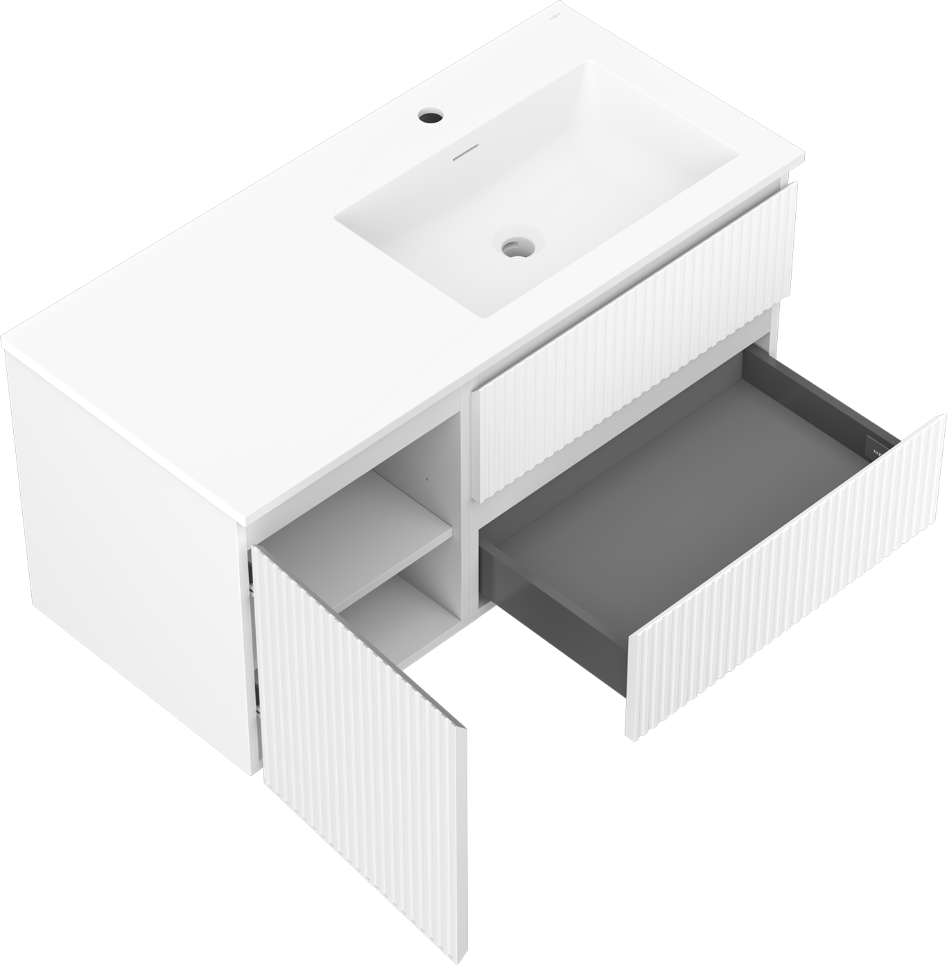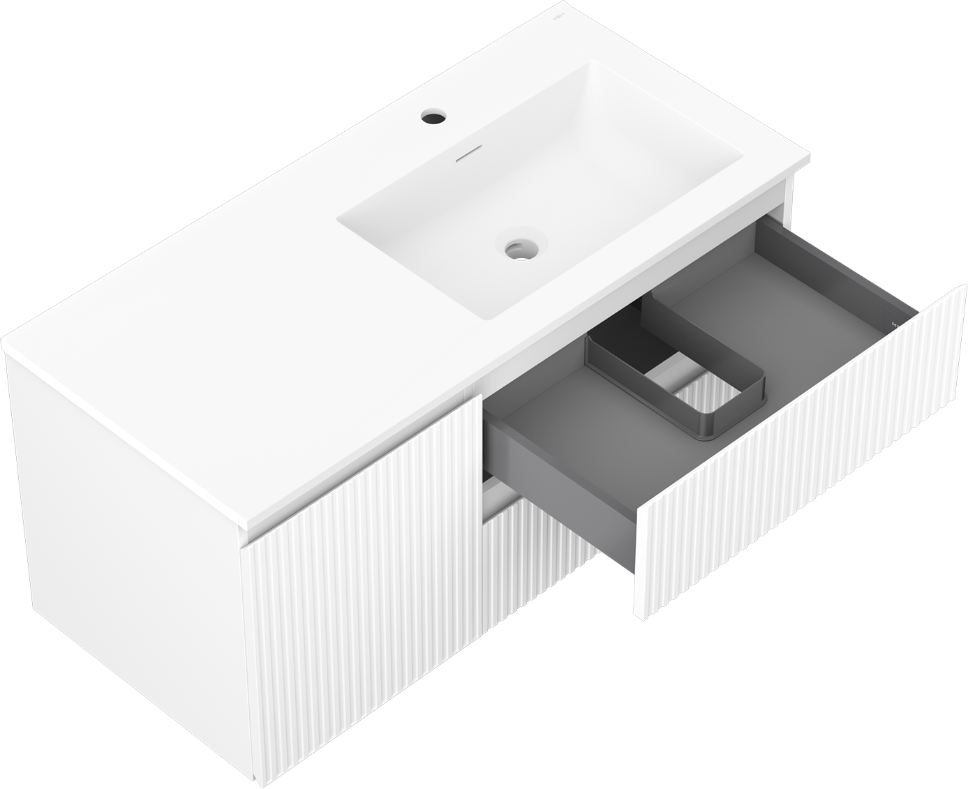 Výřez v zásuvce je navržen tak, aby pojmul sifon, který je nezbytný v instalacích umyvadlových. Díky tomu může být nábytek plně funkčně namontován, aniž by bylo nutné vzdát se prostoru v zásuvce ve prospěch instalace.