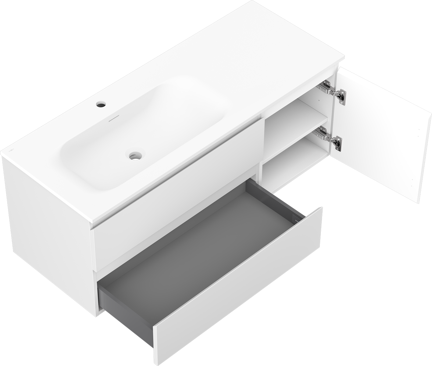 Výřez v zásuvce je navržen tak, aby pojmul sifon, který je nezbytný v instalacích umyvadlových. Díky tomu může být nábytek plně funkčně namontován, aniž by bylo nutné vzdát se prostoru v zásuvce ve prospěch instalace.