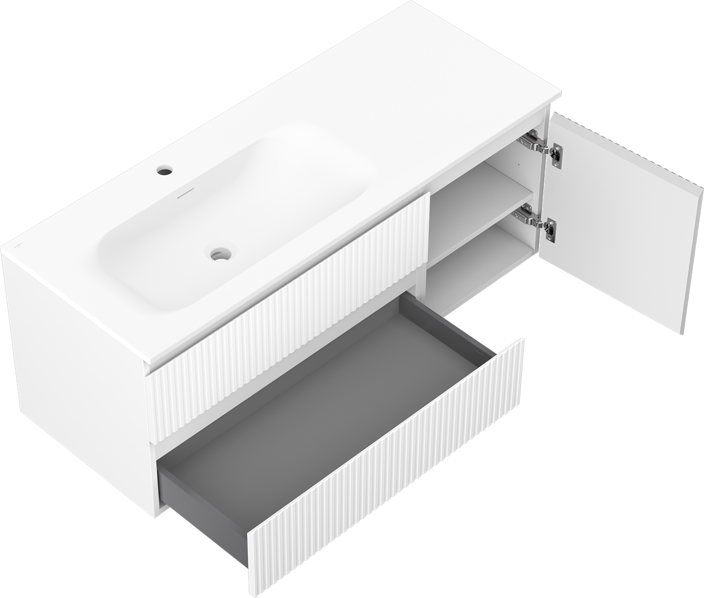 Výřez v zásuvce je navržen tak, aby pojmul sifon, který je nezbytný v instalacích umyvadlových. Díky tomu může být nábytek plně funkčně namontován, aniž by bylo nutné vzdát se prostoru v zásuvce ve prospěch instalace.