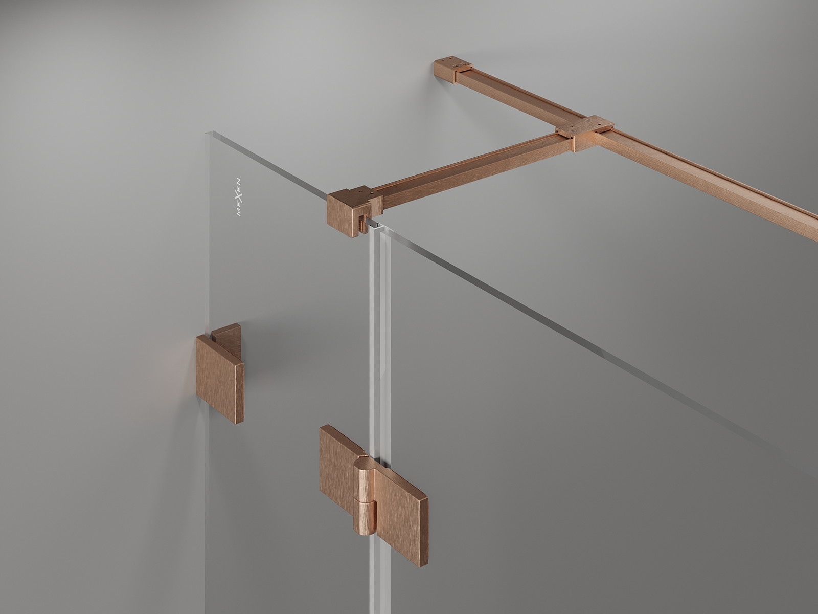 Mosazné kliky a závěsy zarovnané se skleněnou deskou