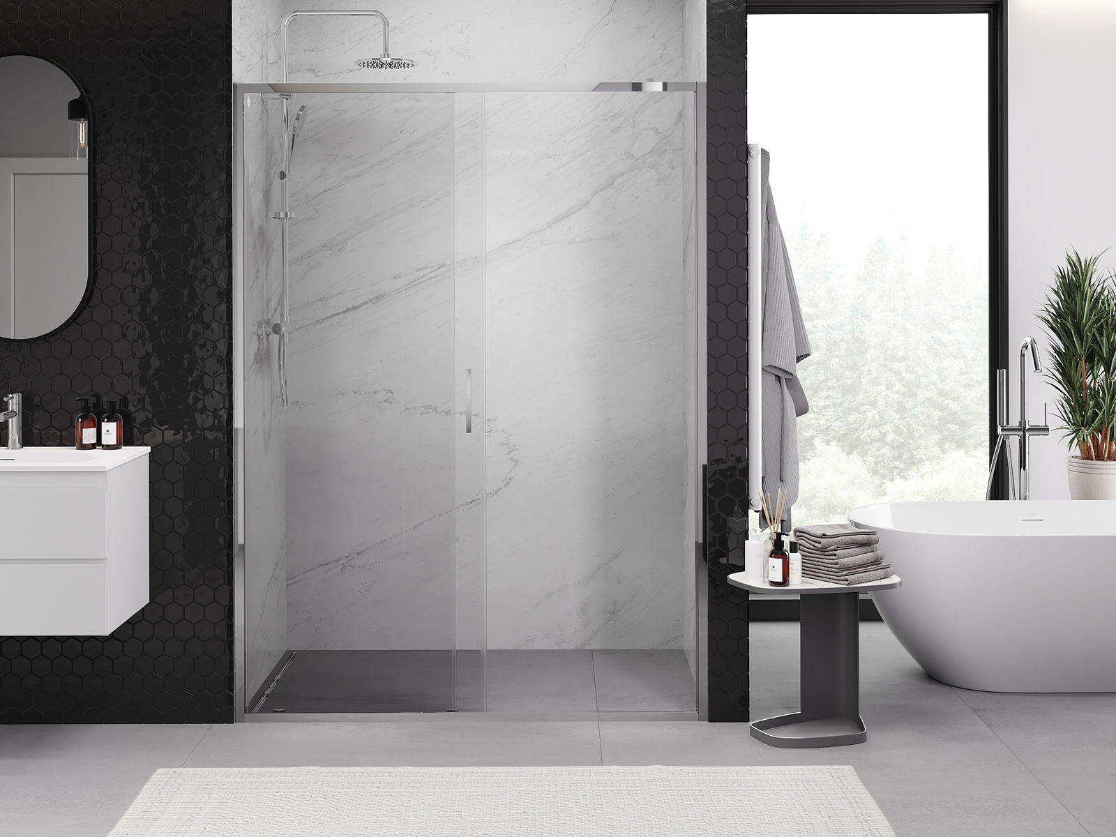 Praktická a pohodlná rukojeť je vyrobena z odolného a trvanlivého kovu. Moderní tvar ve spojení s povrchovou úpravou, která ladí s barvou profilů, dodává celku moderní a stylový vzhled, zdůrazňující estetiku každé koupelny.