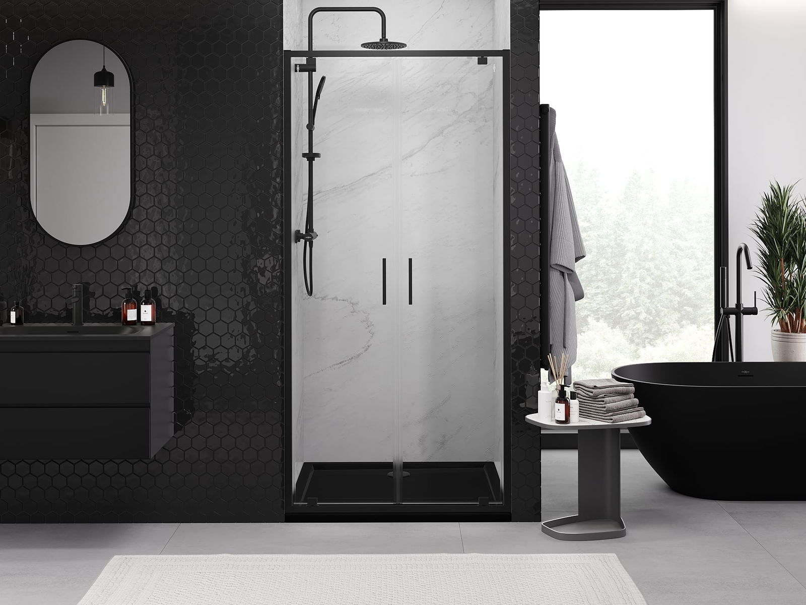 Praktická a pohodlná rukojeť je vyrobena z odolného a trvanlivého kovu. Moderní tvar ve spojení s povrchovou úpravou, která ladí s barvou profilů, dodává celku moderní a stylový vzhled, zdůrazňující estetiku každé koupelny.