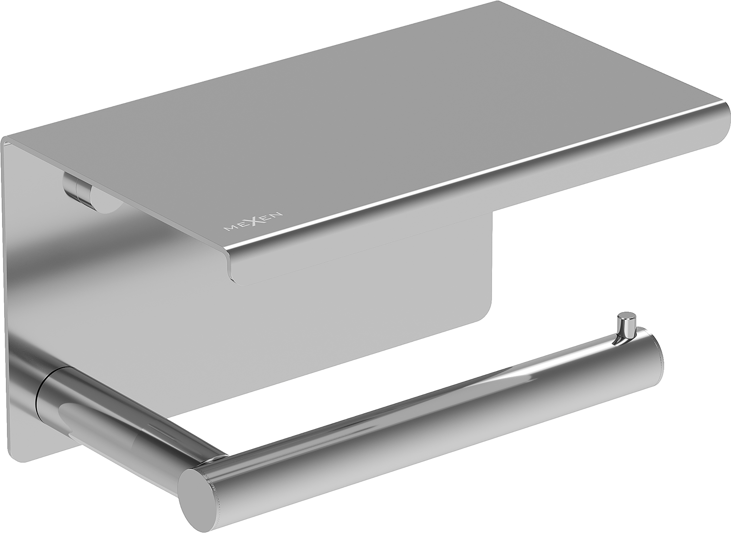 Chromovaný držák na papír s poličkou od Mexen je moderní a velmi praktická verze současných koupelnových doplňků. Má klasický, čtvercový tvar, který ho odlišuje od ostatních produktů této kategorie a estetickou, lesklou barvu.
