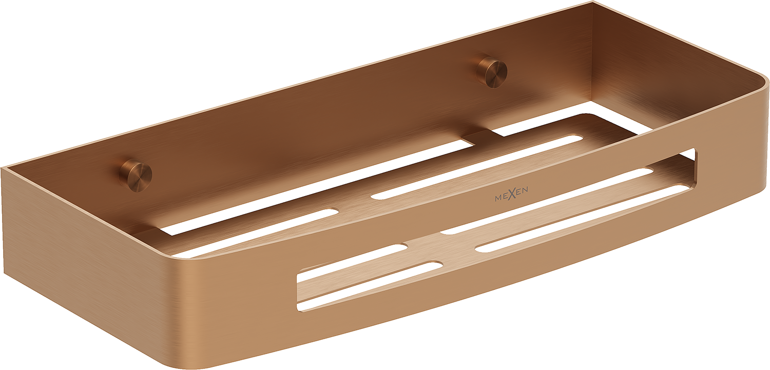 Mexen Laxo-L koupelnový košík v barvě kartáčované mědi je elegantním a funkčním řešením pro každou koupelnu. Vyroben z odolné nerezové oceli AISI 304, zajišťuje trvanlivost a odolnost proti korozi a matování. Šířka 30 cm, výška 4,5 cm a vzdálenost od stěny 13 cm činí z něj kompaktní volbu, která nezabírá příliš mnoho místa. Košík má otvory, které umožňují rychlé odvodnění, což zvyšuje jeho praktičnost.