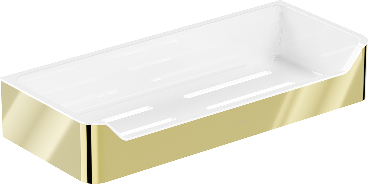 Mexen Rivon-L košík do koupelny, zlatý je elegantní a funkční řešení pro vaši koupelnu. Vyroben z odolné nerezové oceli AISI 304 a plastu, je odolný vůči matování a korozi. Zlatá úprava dodává třídu a polička o šířce 30,5 cm a výšce 5,5 cm se dokonale hodí do moderních interiérů. Vzdálenost od stěny je 13 cm a otvory zajišťující rychlý odtok vody jsou dalšími pozitivy tohoto produktu.