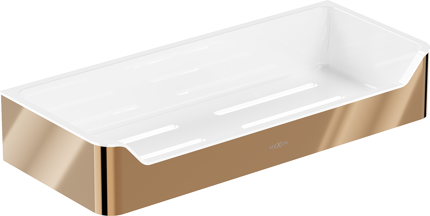Mexen Rivon-L koupelnový košík je elegantní a funkční řešení pro každou koupelnu. Díky výrobě z nerezové oceli AISI 304 a plastu se produkt vyznačuje trvanlivostí a odolností proti zmatnění a korozi. Povrchová úprava v růžovém zlatě dodává luxusní charakter. Košík má šířku 30,5 cm, výšku 5,5 cm a vzdálenost od zdi 13 cm, díky čemuž je ideální pro umístění na zeď. Police s otvory umožňuje rychlý odvod vody, což zvyšuje její funkčnost.