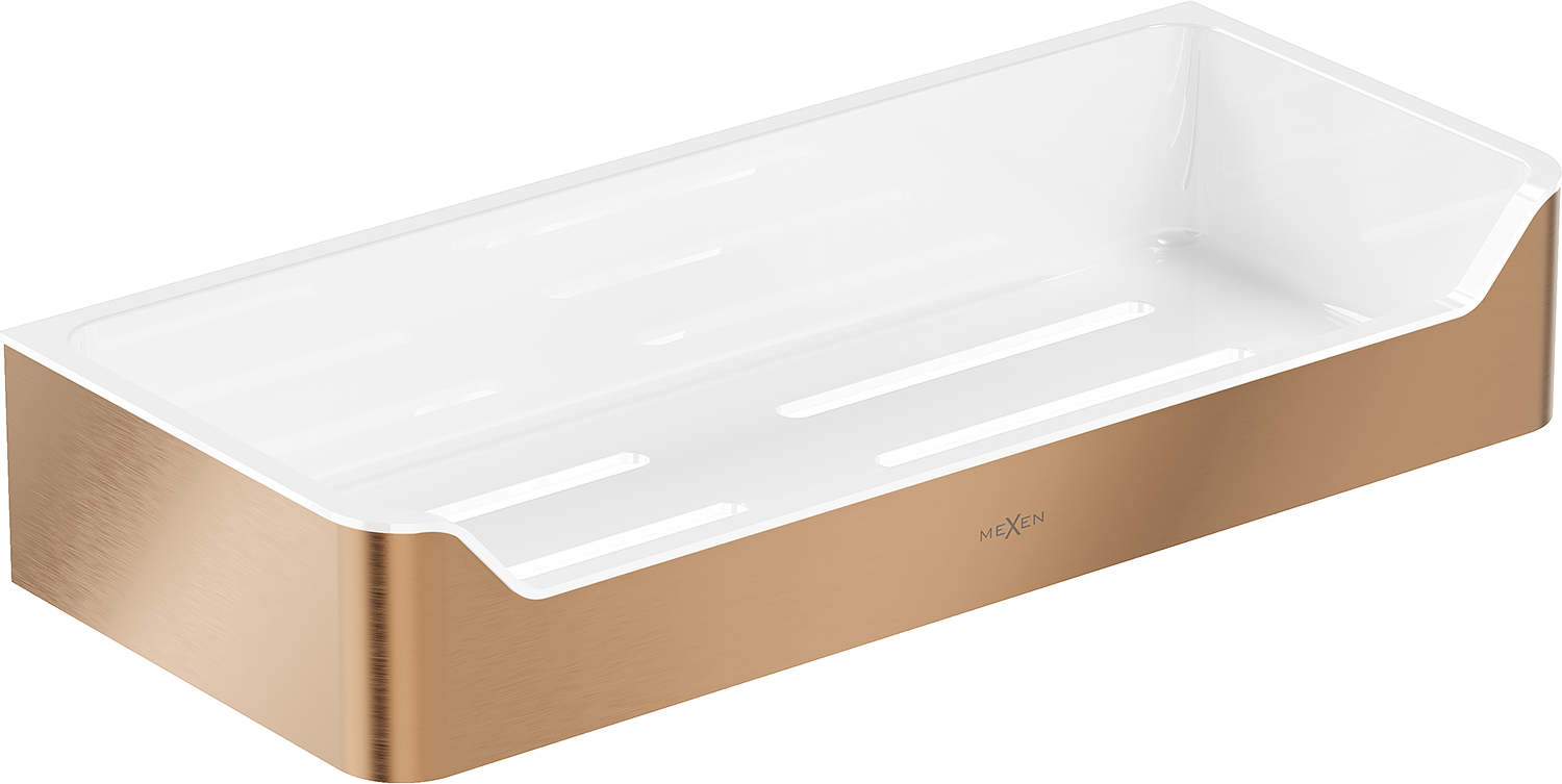 Mexen Rivon-L koupelnový košík je skvělou kombinací funkčnosti a stylu. Vyrobený z odolné nerezové oceli AISI 304 a plastu, zajišťuje dlouhodobou odolnost proti matování a korozi. Košík má elegantní kartáčovanou měděnou povrchovou úpravu, která dodává luxusní vzhled každé koupelně. S šířkou 30,5 cm a výškou 5,5 cm je praktický a jeho otvory umožňují rychlé odvedení vody, udržují pořádek. Odstupuje od stěny pouze na 13 cm, což šetří místo.