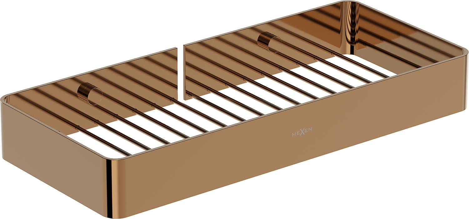Mexen Evos-L košík do koupelny v elegantní povrchové úpravě růžového zlata je ideálním spojením stylu a funkčnosti. Vyroben z vysoce kvalitní nerezové oceli AISI 304, zajišťuje trvanlivost a odolnost vůči korozi a matování. Šířka 29,5 cm a výška 4 cm zajišťují, že se perfektně hodí do většiny koupelnových prostorů. Díky otvorům v poličce voda rychle odtéká, což zajišťuje hygienické používání. Vzdálenost od stěny činí 13 cm, což zaručuje maximální pohodlí.