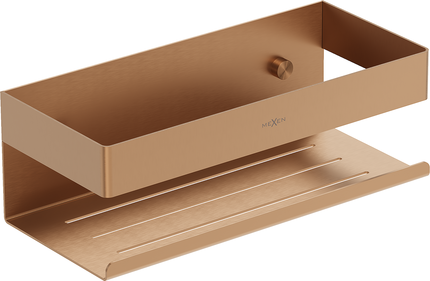 Koupelnový košík Mexen Brin-L je ideálním řešením pro osoby, které ocení eleganci a funkčnost. Vyrobeno z vysoce kvalitní nerezové oceli AISI 304, zajišťuje trvanlivost a odolnost proti korozi. Stylová povrchová úprava kartáčovanou mědí dodává šarm každé koupelně. Díky rozměrům 23 cm na šířku a 8 cm na výšku je košík dostatečně prostorný a vzdálenost od zdi 10 cm zajišťuje pohodlný přístup. Otvory v polici podporují rychlý odvod vody, což zabraňuje matování a hromadění vlhkosti.