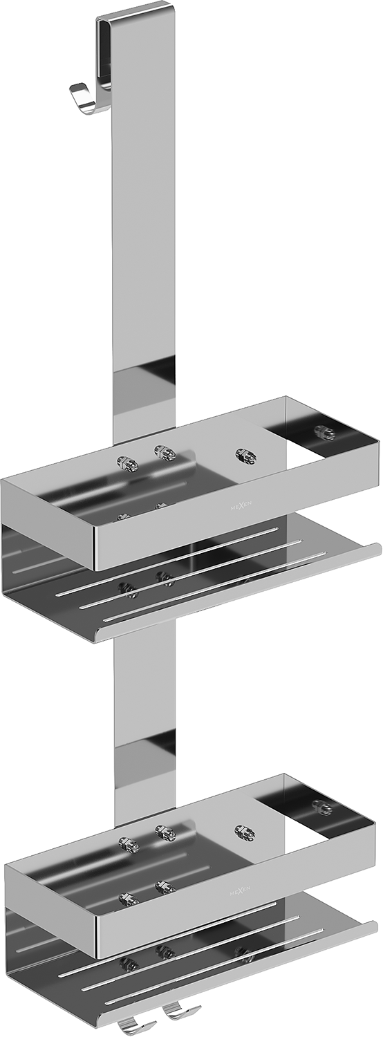 Mexen Brin-2 koupelnový košík s háčkem, chrom je vynikající volbou pro vaši koupelnu. Vyroben z vysoce kvalitní nerezové oceli AISI 304 a pokryt chromem je nejen elegantní, ale také odolný proti matování a korozi. Šířka 23 cm a výška 70 cm zajišťují, že je kompaktní a zároveň praktický. Díky dvěma policím a otvorům pro odvod vody poskytuje pořádek v koupelně. Háčky po stranách a přísavky zajišťují stabilitu a funkčnost. Perfektně sedí na sprchové zástěny o tloušťce do 12 mm.