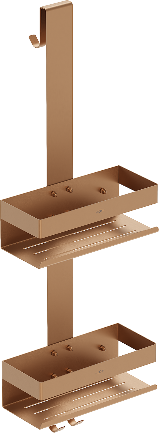 Mexen Brin-2 je elegantní koupelnový košík s věšákem v kartáčované mědi, který dokonale kombinuje styl a funkčnost. Vyrobený z odolné nerezové oceli AISI 304, je odolný proti matování a korozi. Díky dvěma policím o šířce 23 cm a výšce 70 cm nabízí dostatek místa na kosmetiku a příslušenství. Stabilitu zajišťují přísavky a otvory v policích umožňují rychlé odvádění vody. Univerzální design se hodí pro sprchové sklo o tloušťce do 12 mm a háčky umožňují pohodlné zavěšení ručníků.