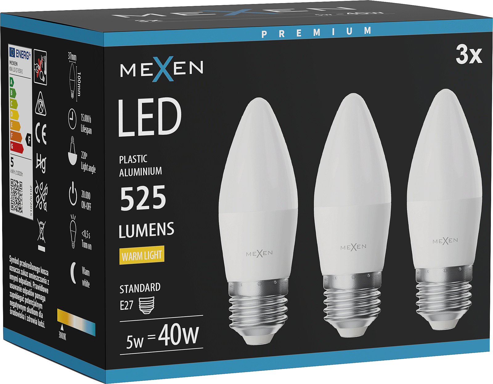 Mexen Nova 3x LED žárovka E27, C37, 5W, Teplá - 3000K, 525 lm - L102-E27-0530-01x03