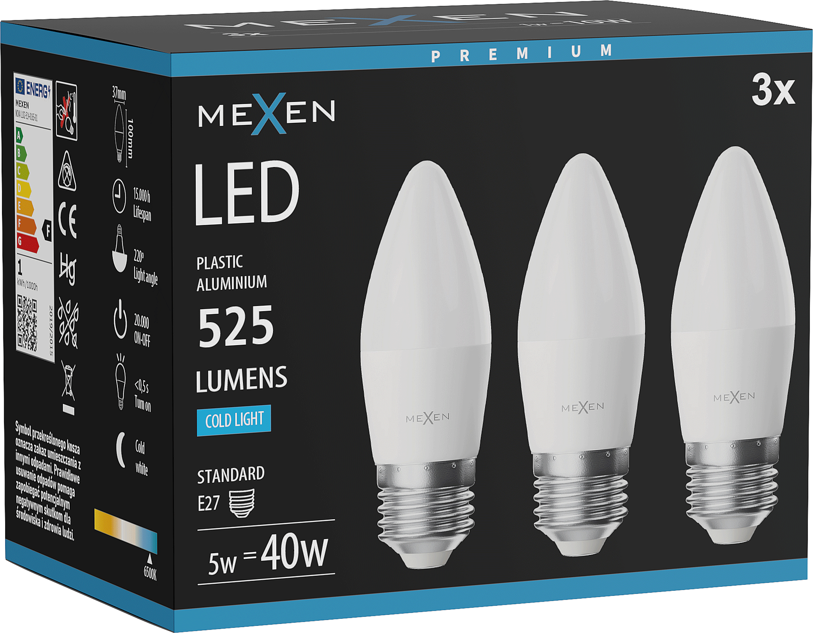 Mexen Nova 3x LED žárovka E27, C37, 5W, Studená - 6500K, 525 lm - L102-E27-0565-01x03