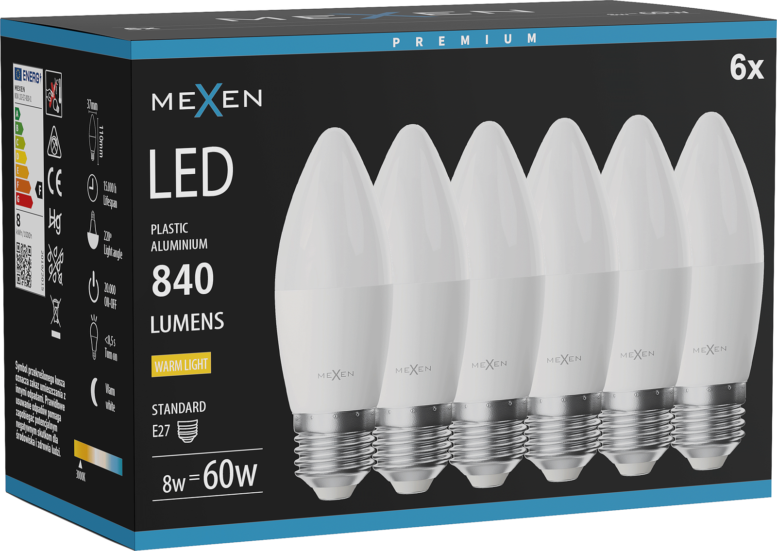 Mexen Nova 6x LED žárovka E27, C37, 8W, Teplá - 3000K, 840 lm - L102-E27-0830-01x06