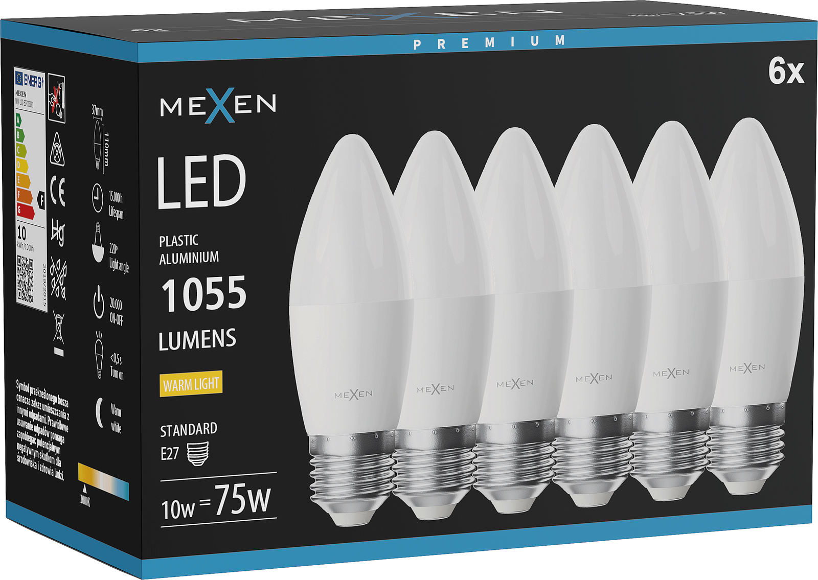 Mexen Nova 6x LED žárovka E27, C37, 10W, Teplá - 3000K, 1055 lm - L102-E27-1030-01x06