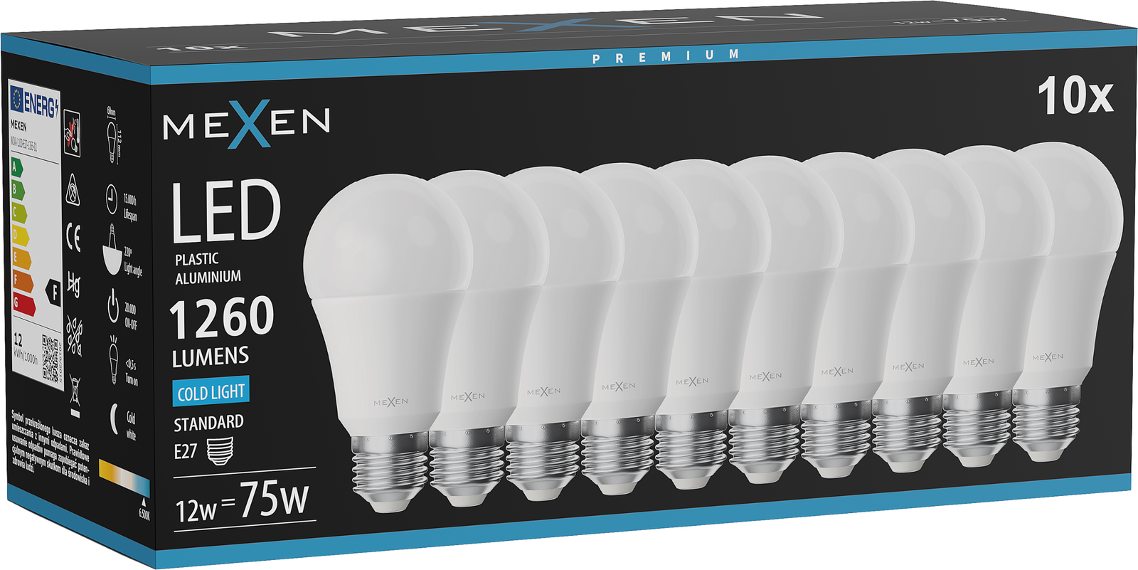 Mexen Nova 10x LED žárovka E27, A60, 12W, Studená - 6500K, 1260 lm - L100-E27-1265-01x10