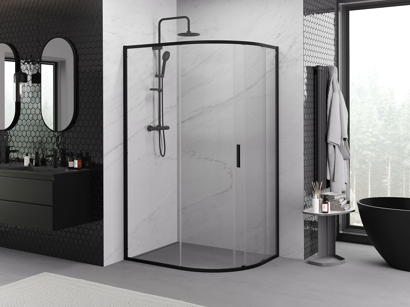 Mexen Exo asymetrická posuvná polokruhová sprchová kabina 120 x 80 cm, transparentní, černá - 8131-120-080-70-00