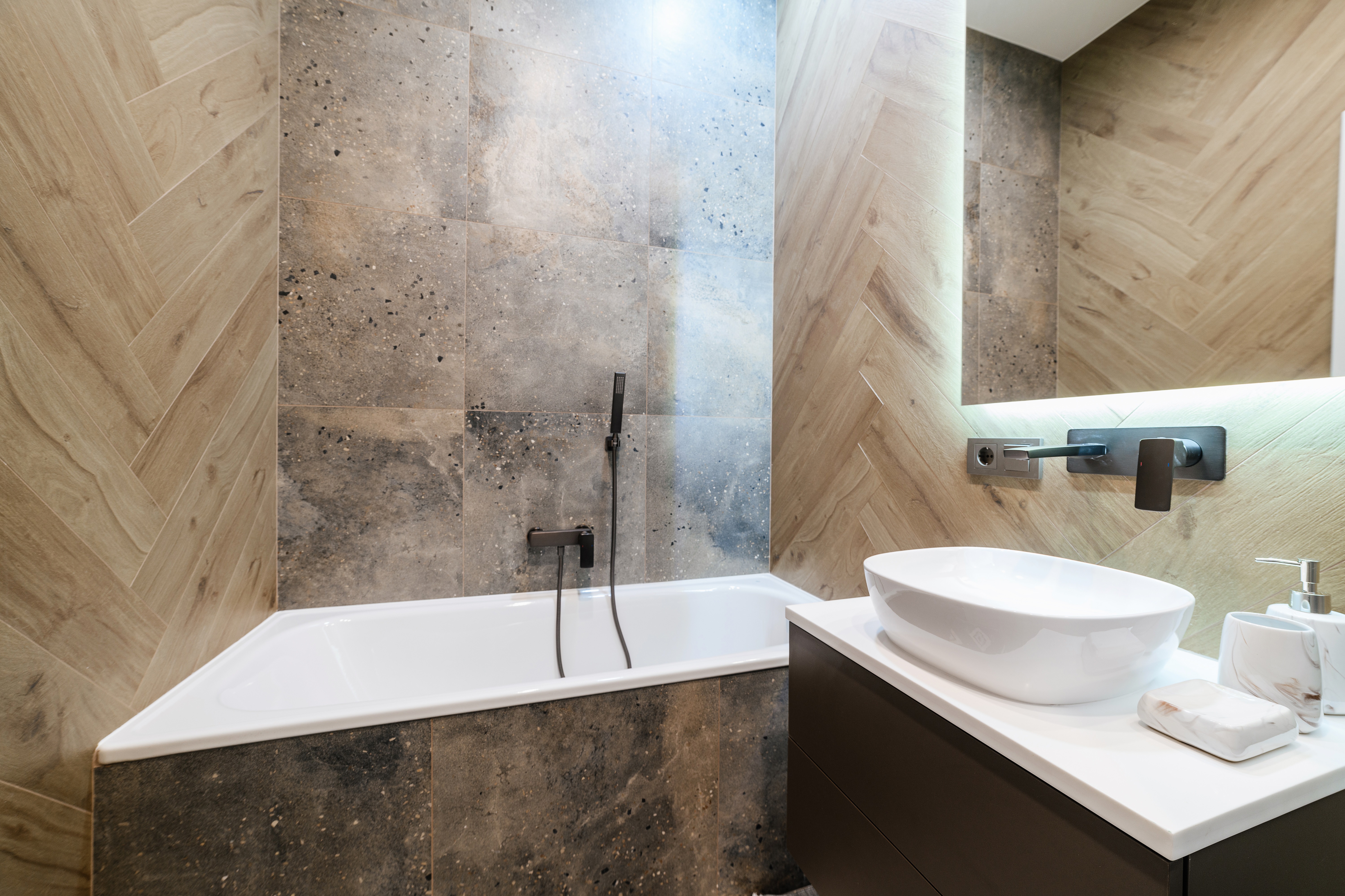 V Mexen věříme, že třídu interiéru určují detaily. Pokud se ve vaší koupelně objeví černá spára, bude ideálním doplňkem pro černou armaturu. Takové spojení způsobí, že spáry pro dlaždice napodobující dřevo se stanou součástí širšího aranžmá. Pokud se interiéroví designéři rozhodnou pro zlato nebo měď, stojí za to vybrat barvu spáry pro dlaždice v teplých, hnědých odstínech. Tento odstín zvýrazní lesk kovu z umyvadlových a sprchových baterií, vytvářející harmonický celek s dlaždicemi napodobujícími dřevo.